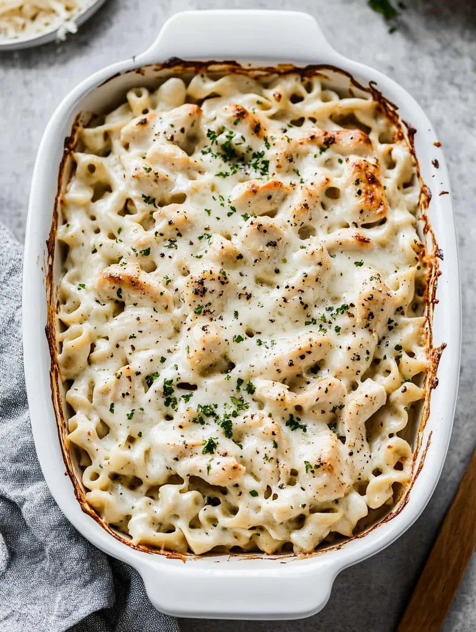 This Alfredo bake pairs wonderfully with a simple green salad dressed with lemon vinaigrette to cut through the richness. For a complete meal, serve alongside roasted vegetables like asparagus or Brussels sprouts. Garlic bread works fantastically for mopping up extra sauce, though the dish stands perfectly well on its own. If you want a drink pairing, go for a crisp Pinot Grigio or unoaked Chardonnay to complement the creamy flavors.
